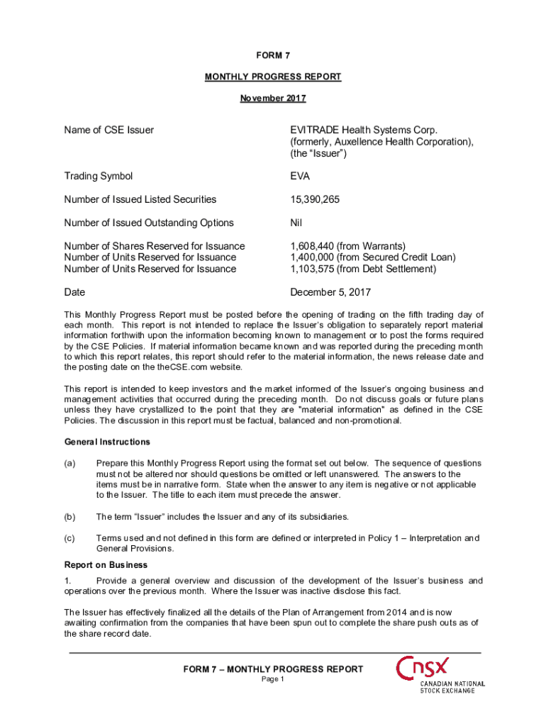 November 2017Name of CSE IssuerEVITRADE Health Systems Corp.