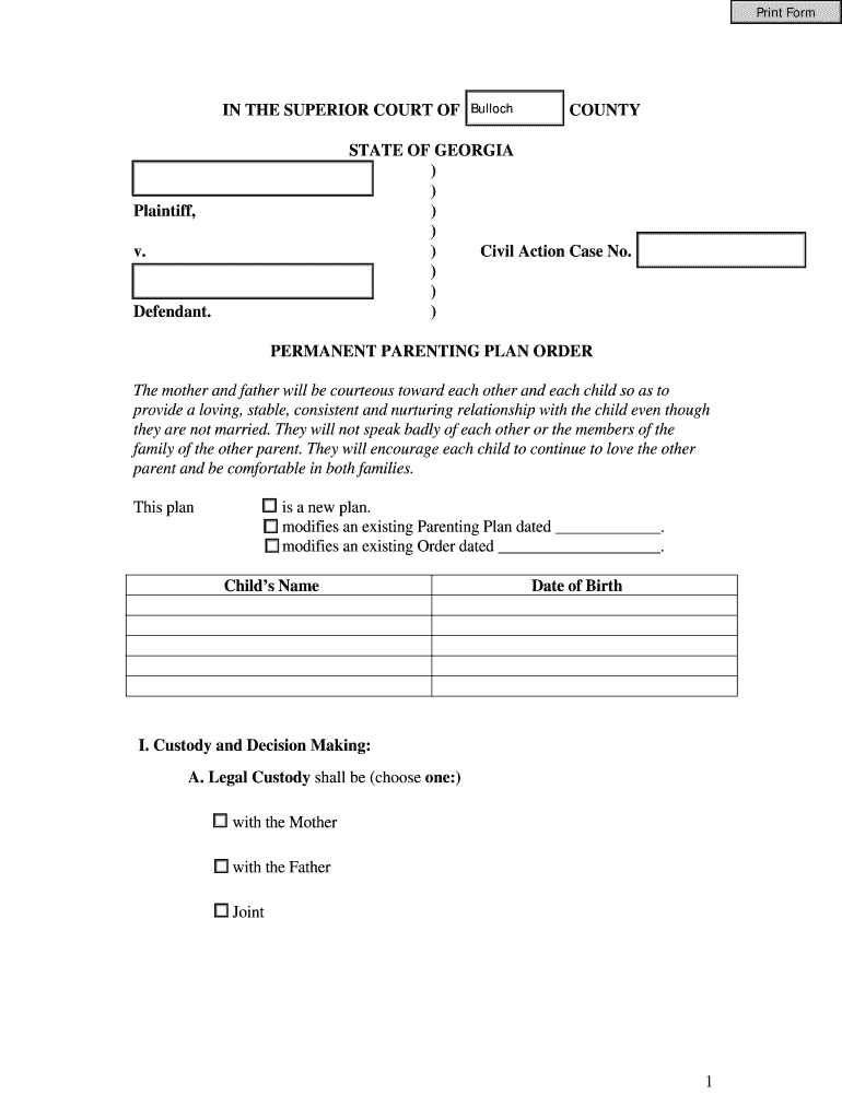 Get the free Georgia Permanent Parenting Plan Order