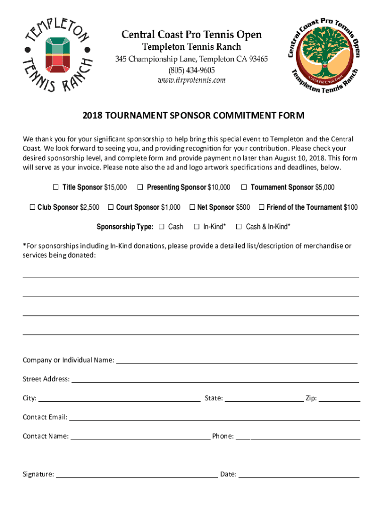 2018 TOURNAMENT SPONSOR COMMITMENT FORM We thank you for your significant sponsorship to help bring this special event to Templeton and the Central Coast. We look forward to seeing you, and providing