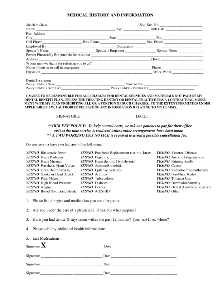 MEDICAL HISTORY AND INFORMATION Mr./Mrs./Miss Soc. Sec. No. Name Age Birth Date Res. Address City State Zip Cell Phone Bus. Phone Res. Phone Employed By Occupation Spouses Name Spouses Employer Spouse