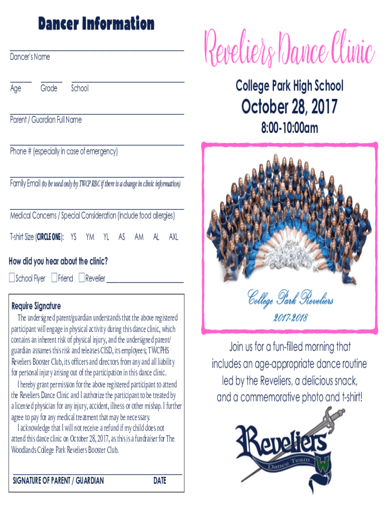 Dancer Information Dancers Name Age Grade School Parent / Guardian Full Name Phone # (especially in case of emergency)Revelers Dance Clinic College Park High School October 28, 2017 8:0010:00am Family