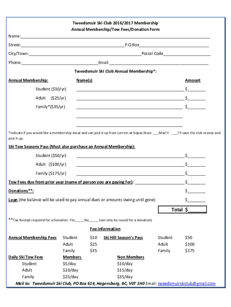 Tweedsmuir Ski Club 2016/2017 Membership Annual Membership/Tow Fees/Donation Form Name: Street: P.O. Box City/Town: Postal Code Phone: Email: Tweedsmuir Ski Club Annual Membership*: Annual Membership:Name(s)AmountStudent