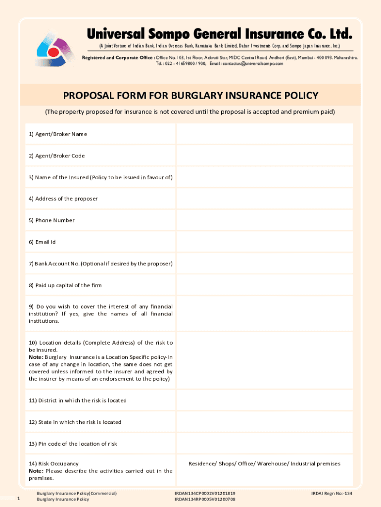 (A Joint Venture of Indian Bank, Indian Overseas Bank, Karnataka Bank Limited, Debut Investments Corp. and Compo Japan Insurance. Inc.) Registered and Corporate Office : Office No. 103, 1st Floor,