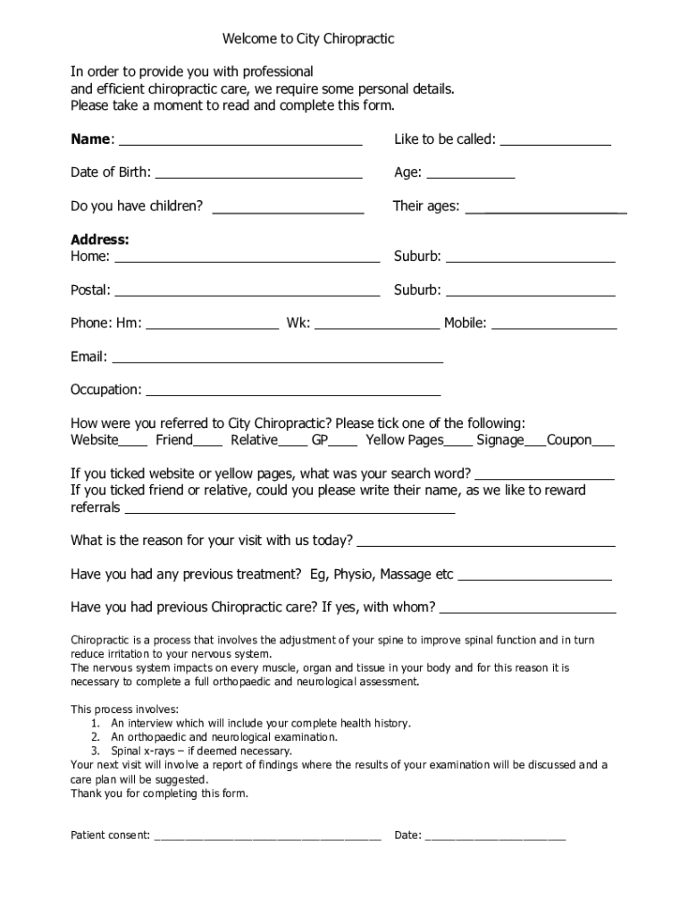 Welcome to City Chiropractic In order to provide you with professional and efficient chiropractic care, we require some personal details. Please take a moment to read and complete this form. Name: