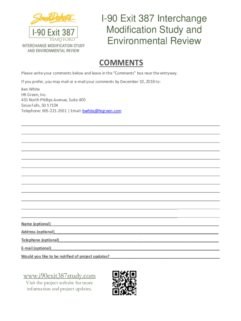 I90 Exit 387 Interchange Modification Study and Environmental Review COMMENTS Please write your comments below and leave in the Comments box near the entryway. If you prefer, you may mail or email