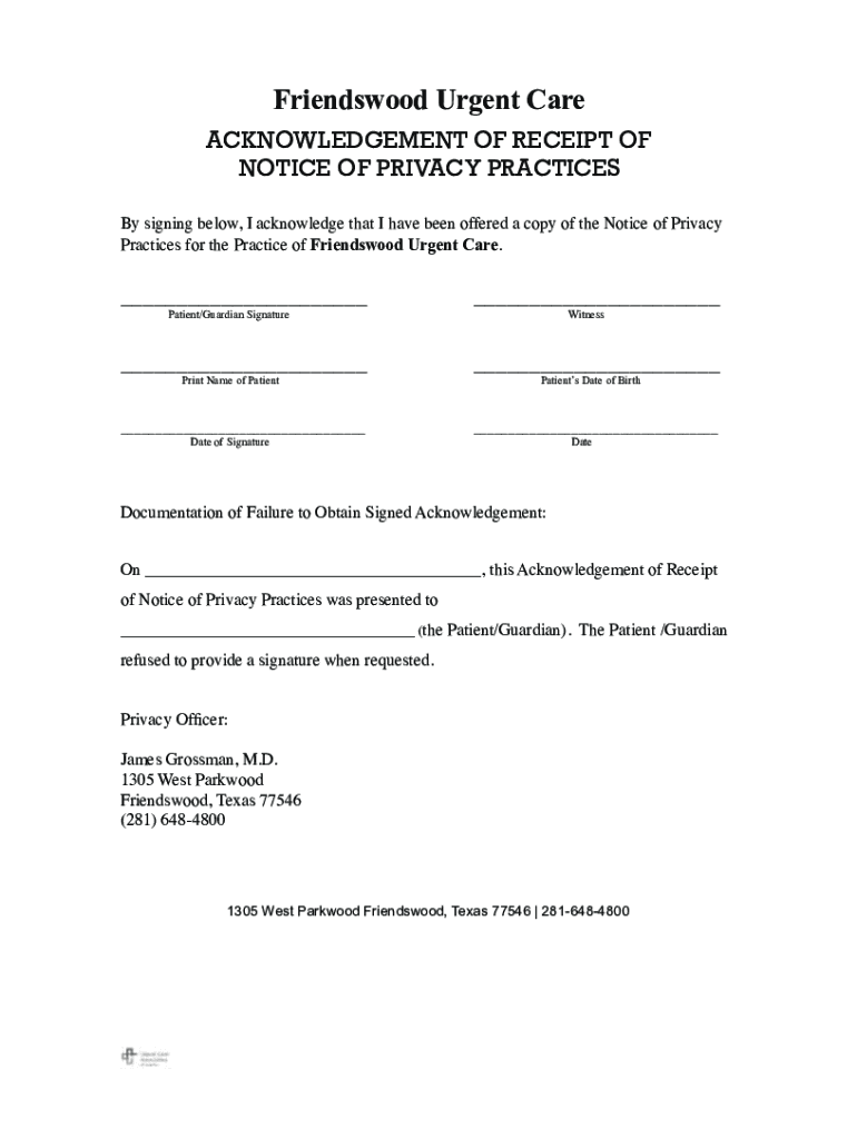 Friends wood Urgent Care ACKNOWLEDGEMENT OF RECEIPT OF NOTICE OF PRIVACY PRACTICES By signing below, I acknowledge that I have been offered a copy of the Notice of Privacy Practices for the Practice