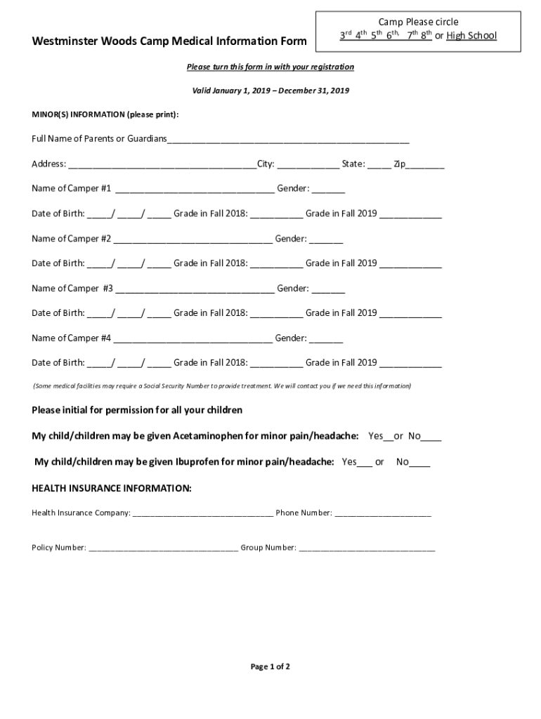 Westminster Woods Camp Medical Information Form3rd4thCamp Please circle 6th, 7th 8th or High School5thPlease turn this form in with your registration Valid January 1, 2019, December 31, 2019, MINOR(S)