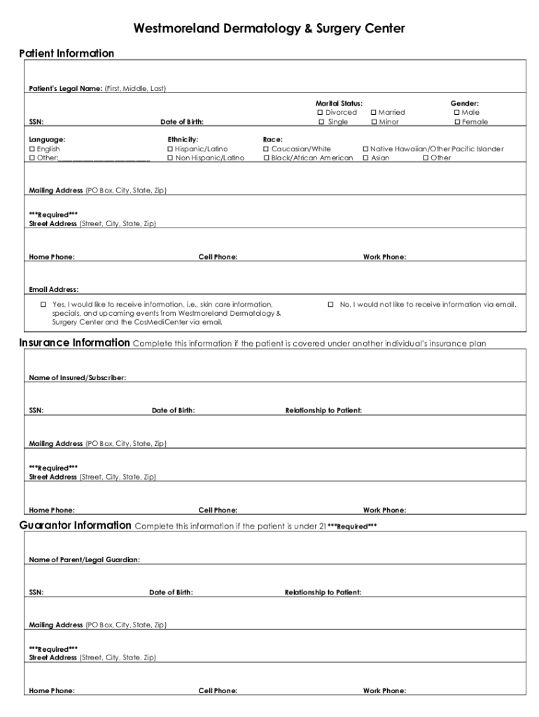 Westmoreland Dermatology & Surgery Center Patient Information Patients Legal Name: (First, Middle, Last)SSN:Marital Status: Divorced Single Date of Birth:Language: English Other: Ethnicity: Hispanic/Latino