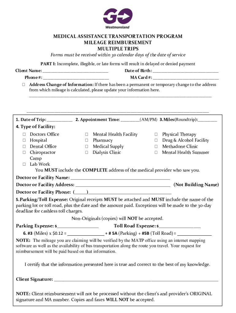 MEDICAL ASSISTANCE TRANSPORTATION PROGRAM MILEAGE REIMBURSEMENT MULTIPLE TRIPS Forms must be received within 30 calendar days of the date of service PART I: Incomplete, illegible, or late forms will