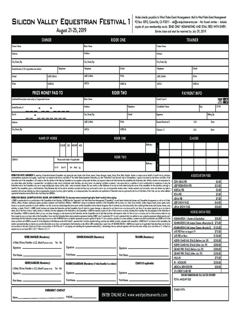 Silicon Valley Equestrian Festival 1 August 2125, 2019OWNERMake checks payable to West Palms Event Management. Mail to West Palms Event Management PO Box 1092, Camarillo, CA 93011 AK westpalmsevents.com