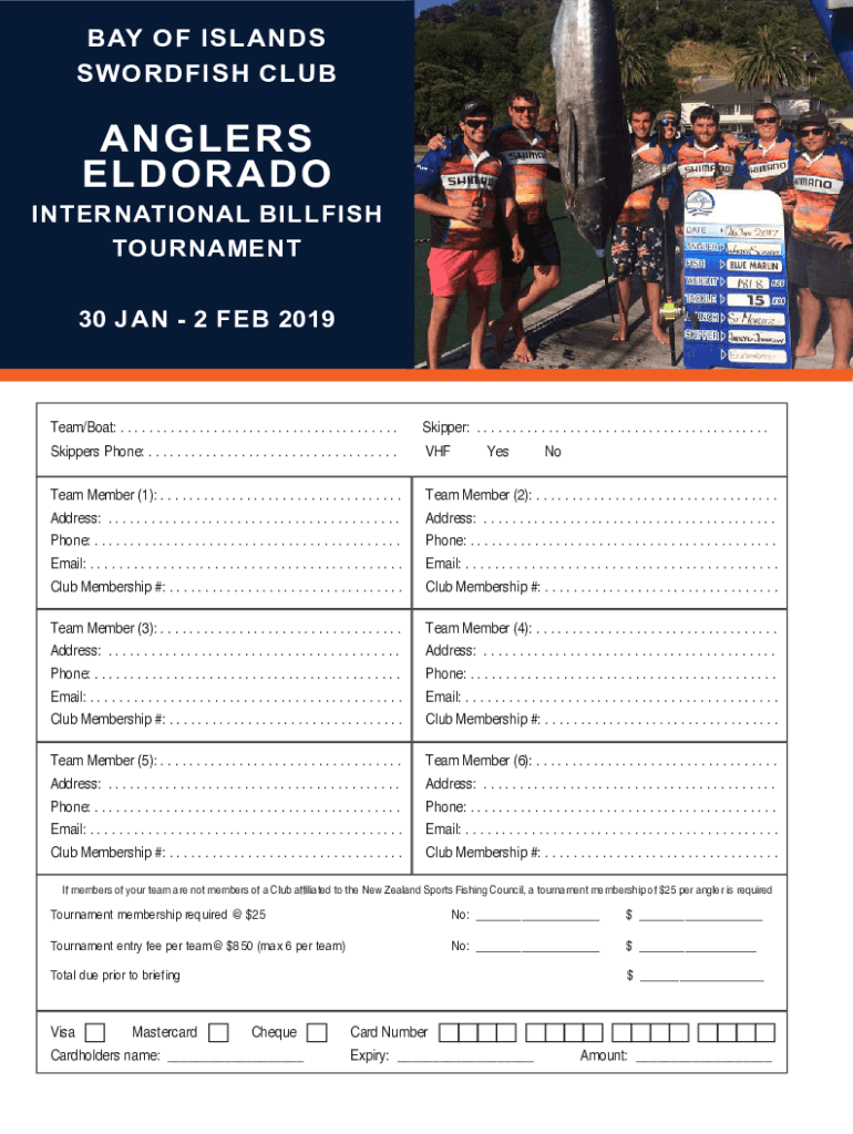 BAY OF ISLANDS SWORDFISH CLANGERS ELDORADOINTERNATIONAL BILLFISH TOURNAMENT 30 JAN 2 FEB 2019Team/Boat:. . . . . . . . . . . . . . . . . . . . . . . . . . . . . . . . . . . . . . . Skipper:. . . .