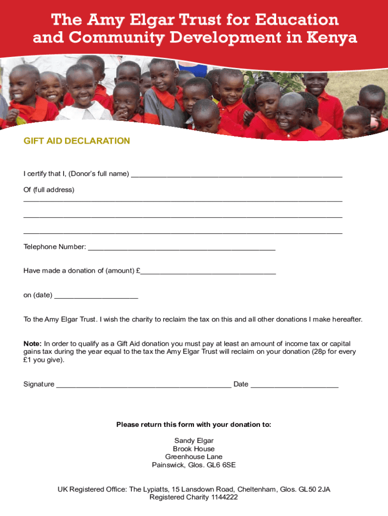 The Amy Elgar Trust for Education and Community Development in KenyaGIFT AID DECLARATION certify that I, (Donors full name) Of (full address) Telephone Number: Have made a donation of (amount) on