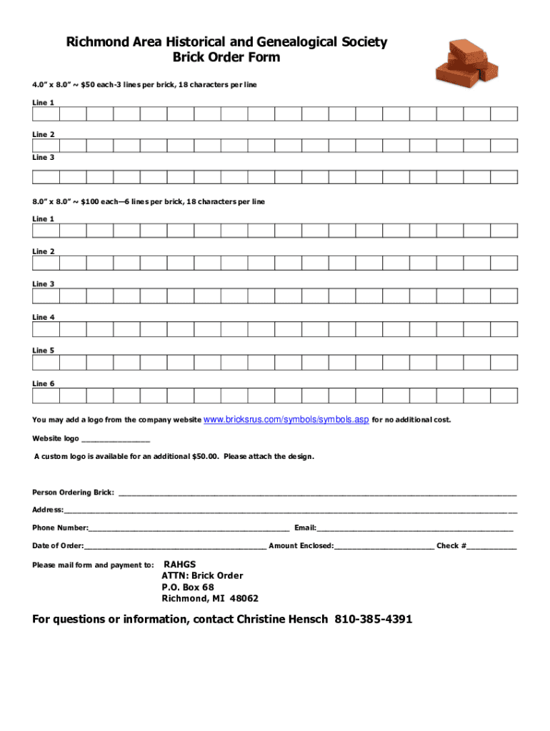 Richmond Area Historical and Genealogical Society Brick Order Form 4.0 × $8.050 each3 lines per brick, 18 characters per line 1Line 2 Line 38.0 × $8.0100 each6 lines per brick, 18 characters per