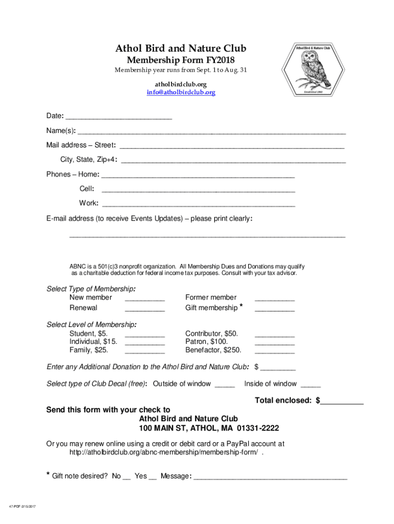 Thou Bird and Nature Club Membership Form FY2018 Membership year runs from Sept. 1 to Aug. 31 atholbirdclub.org info atholbirdclub.ornate: Name(s): Mail address Street: City, State, Zip+4: Phones