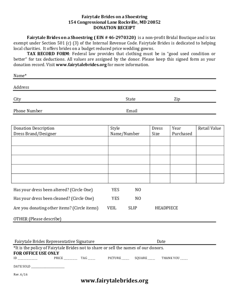Fairy tale Brides on a Shoestring (EIN # 462970320) is a nonprofit Bridal Boutique and is tax-exempt under