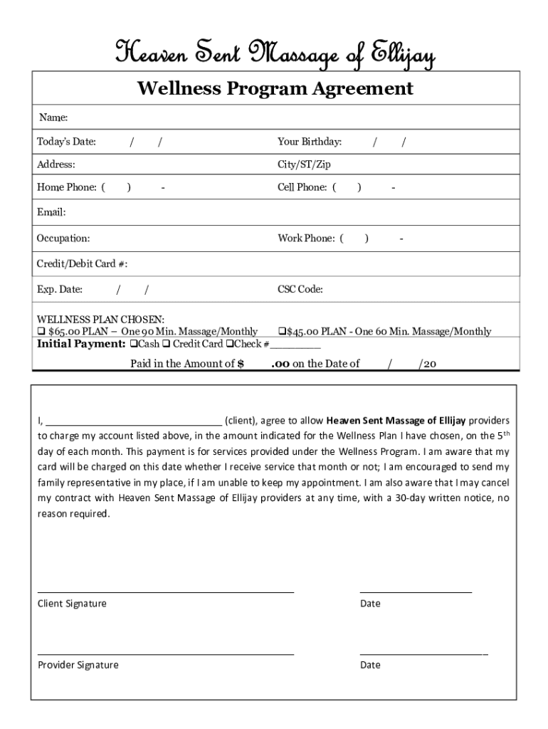 Heaven Sent Massage of Elijah Wellness Program Agreement Name: Today's Date://Address:Your Birthday://City/ST/iPhone Phone: ()Cell Phone: ()Email: Occupation:Work Phone: ()Credit/Debit Card #: Exp.