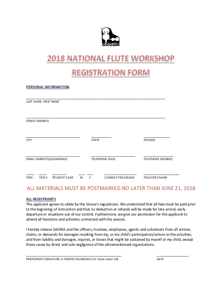 PERSONAL INFORMATION LAST NAME, FIRST NAME STREET ADDRESS CITYSTATEZIPCODE EMAIL (PARENT(S)/GUARDIAN)TELEPHONE (DAY)TELEPHONE (MOBILE) TIER STUDENTS AGE MF CURRENT PIECE/BOOKTEACHERS NAME ALL MATERIALS