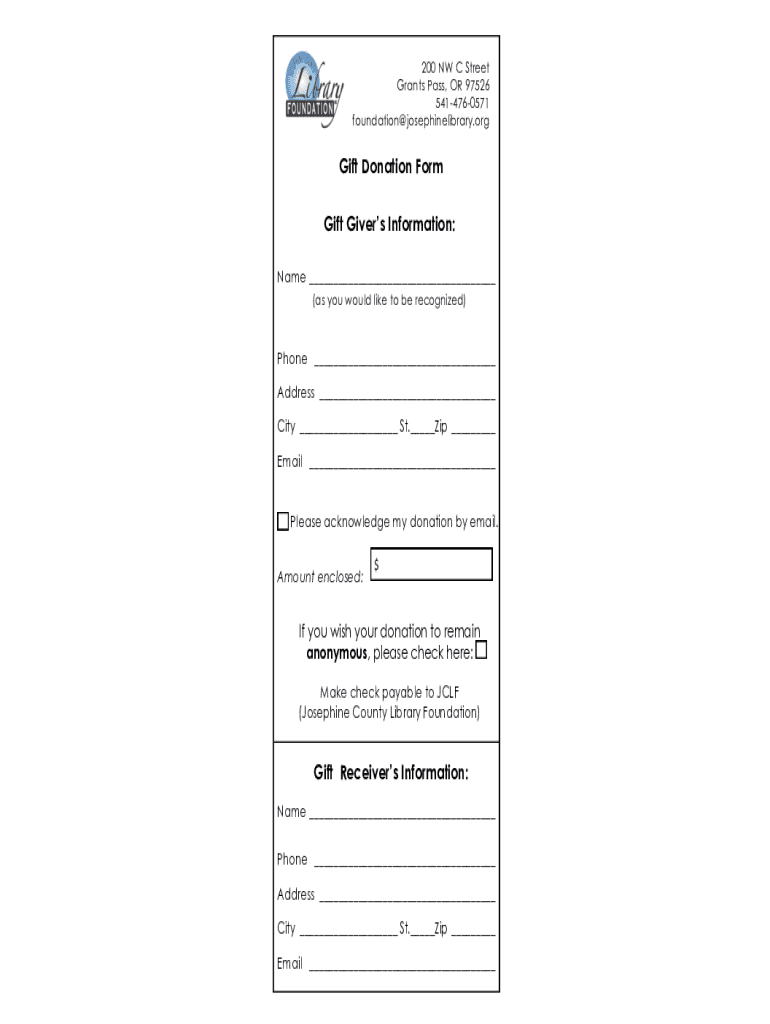 200 NW C Street Grants Pass, OR 97526 5414760571 foundation josephinelibrary. Regift Donation Form Gift Givers Information: Name (as you would like to be recognized)Phone Address City St. Zip Email
