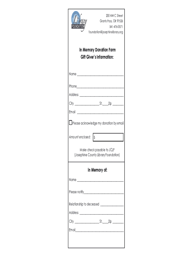 200 NW C Street Grants Pass, OR 97526 5414760571 foundation josephinelibrary. Origin Memory Donation Form Gift Givers Information: Name Phone Address City St. Zip Email Please acknowledge my donation