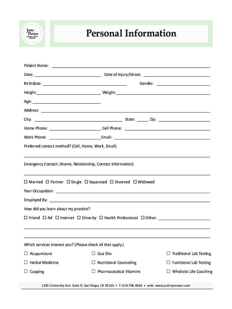 Personal Information Patient Name: Date: Date of Injury/Onset: Birthdate: Gender: Height: Weight: Age: Address: City: State: Zip: Home Phone: Cell Phone: Work Phone: Email: Preferred contact method?