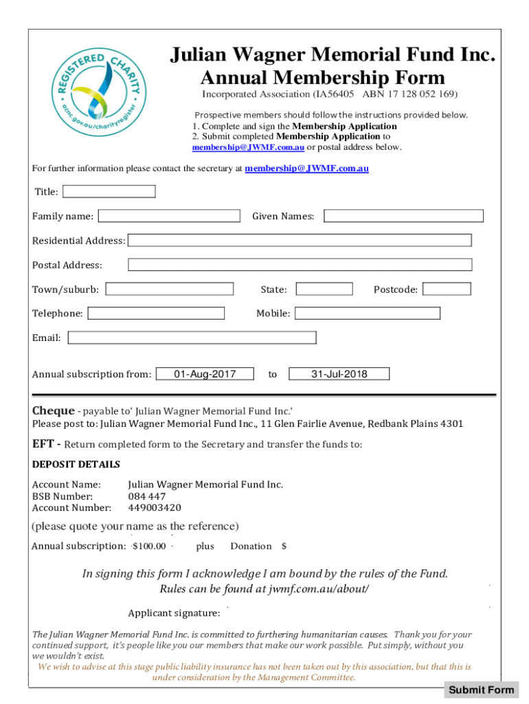 Julian Wagner Memorial Fund Inc. Annual Membership Form Incorporated Association (IA56405 ABN 17 128 052 169) Prospective members should follow the instructions provided below. 1. Complete and sign
