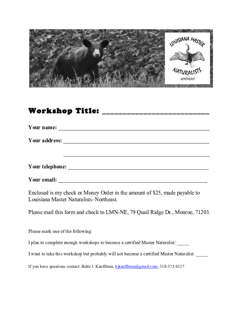 Workshop Title: Your name: Your address: Your telephone: Your email: Enclosed is my check or Money Order in the amount of $25, made payable to Louisiana Master Naturalists Northeast. Please mail this
