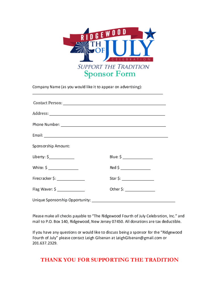 Sponsor Form Company Name (as you would like it to appear on advertising): Contact Person: Address: Phone Number: Email: Sponsorship Amount:Liberty: $ Blue: $ White: $ Red $ Firecracker $: Star $: