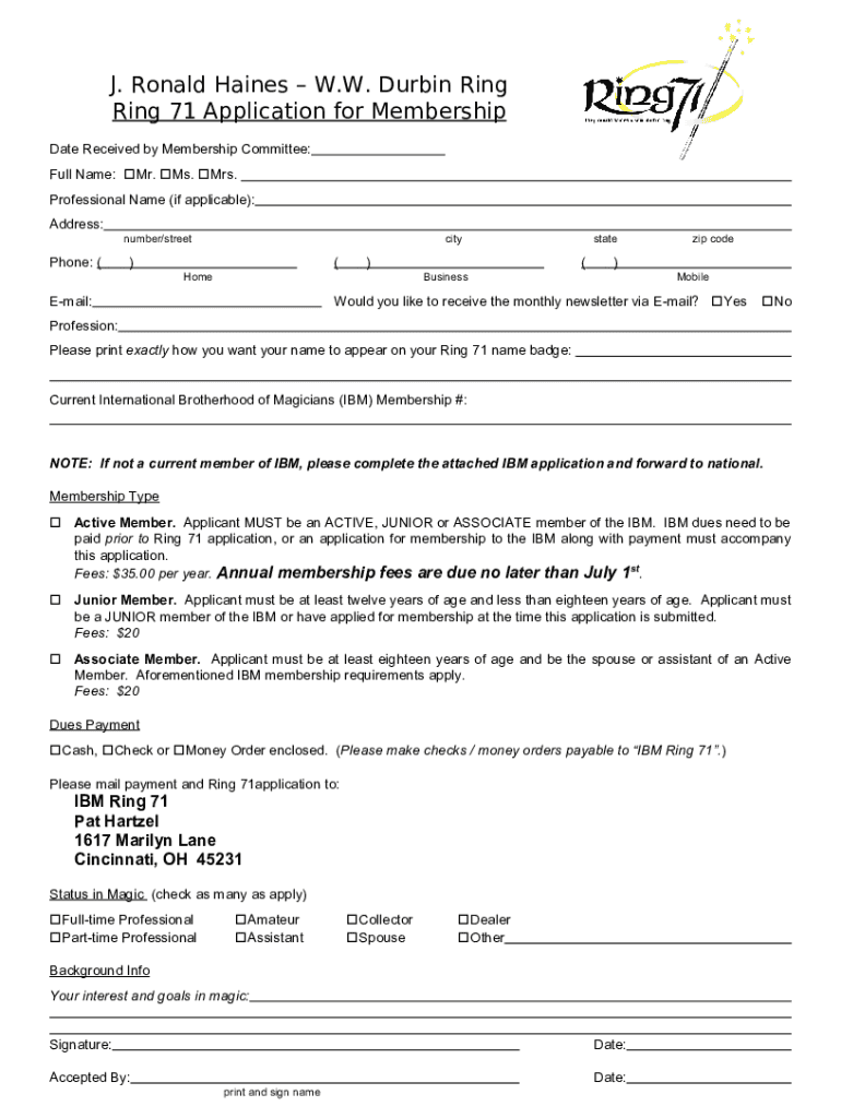 J. Ronald Haines W.W. Durbin Ring Ring 71 Application for Membership Date Received by Membership Committee: Full Name: Mr. Ms. Mrs. Professional Name (if applicable): Address: number/freephone: (city)()Home