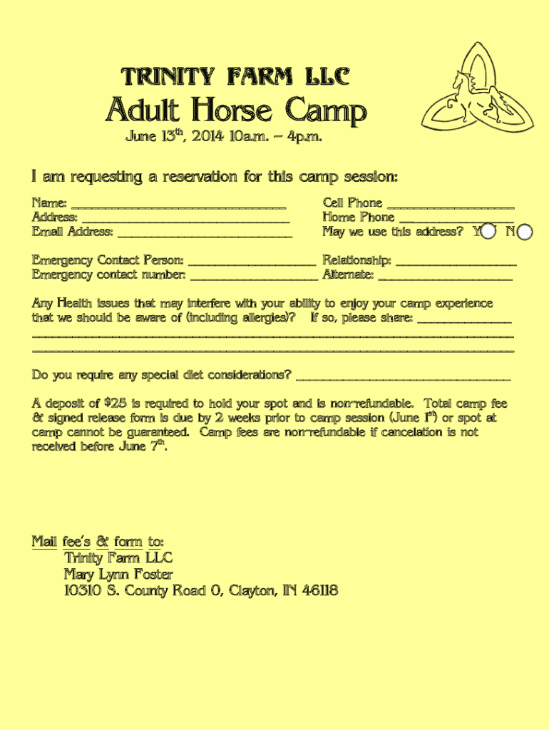 Trinity Farm Adult Horse Camp June 13th, 2014 10a.m. 4p.m. I am requesting a reservation for this camp session: Name: Address: Email Address: Cell Phone Home Phone May we use this address? Y / Emergency