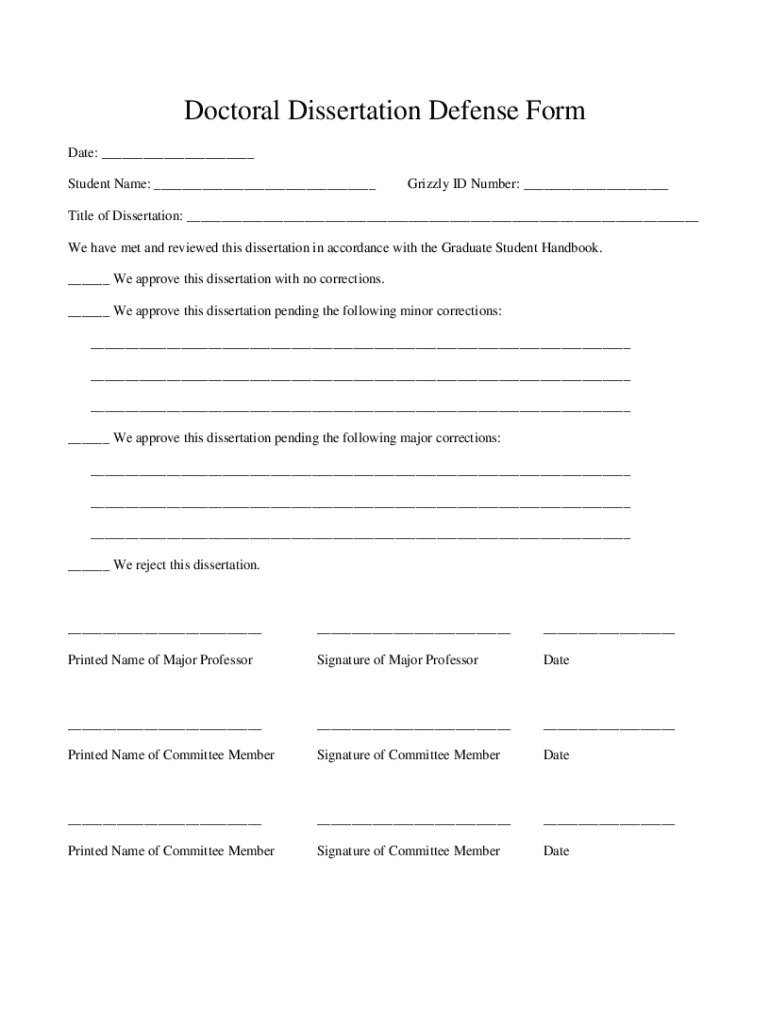 Doctoral Dissertation Defense Form Date: Student Name: Grizzly ID Number: Title of Dissertation: We have met and reviewed this dissertation in accordance with the Graduate Student Handbook. We approve