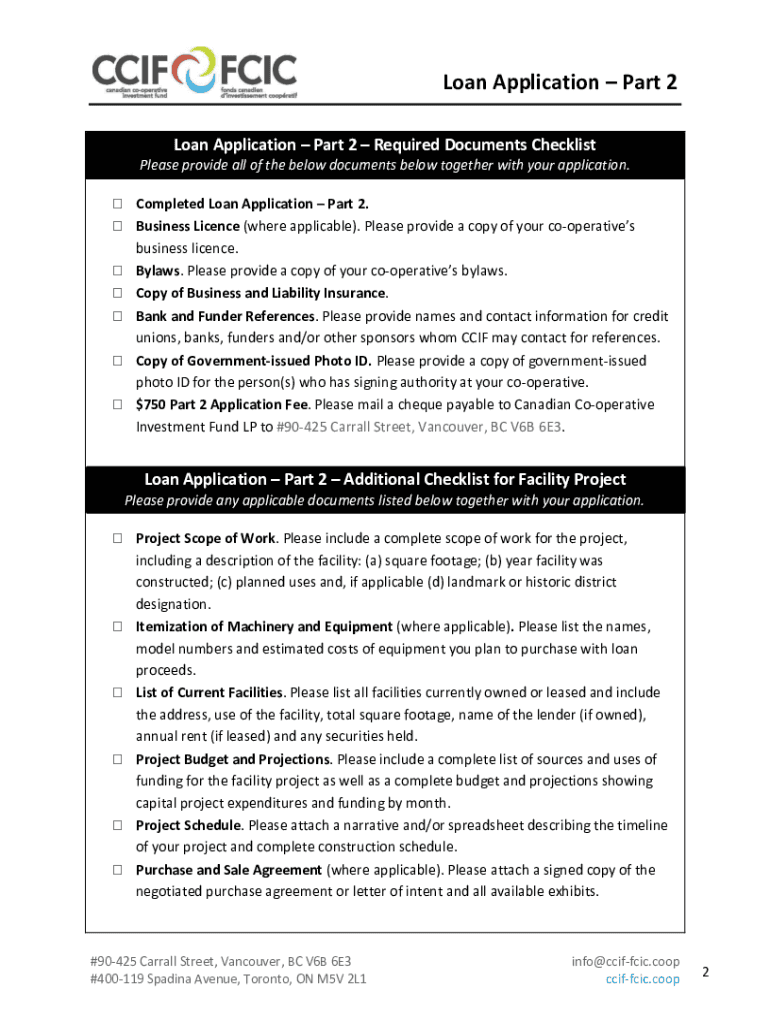 Loan Application Part 2 You are requested to complete Part 2 of the CCI Application as described below in order for CCI to pursue the review of your request for a loan or investment for your cooperative.