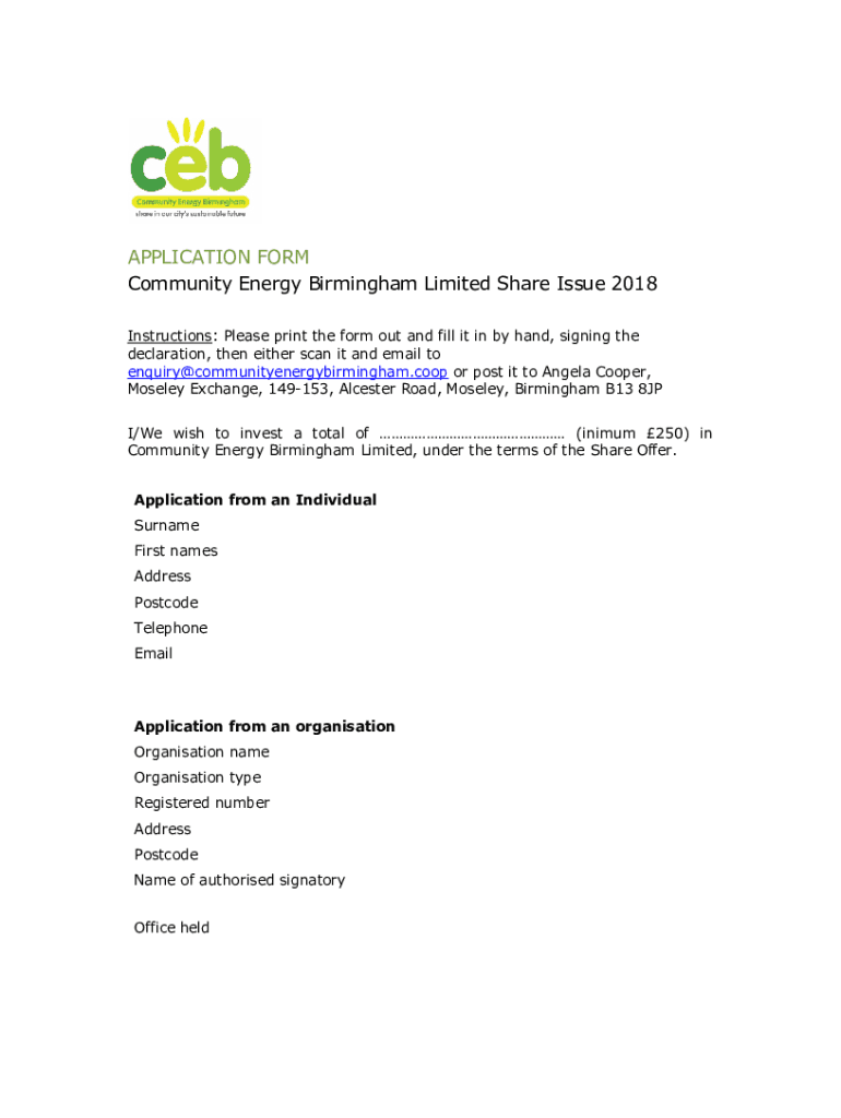 APPLICATION FORM Community Energy Birmingham Limited Share Issue 2018 Instructions: Please print the form out and fill it in by hand, signing the declaration, then either scan it and email to inquiry