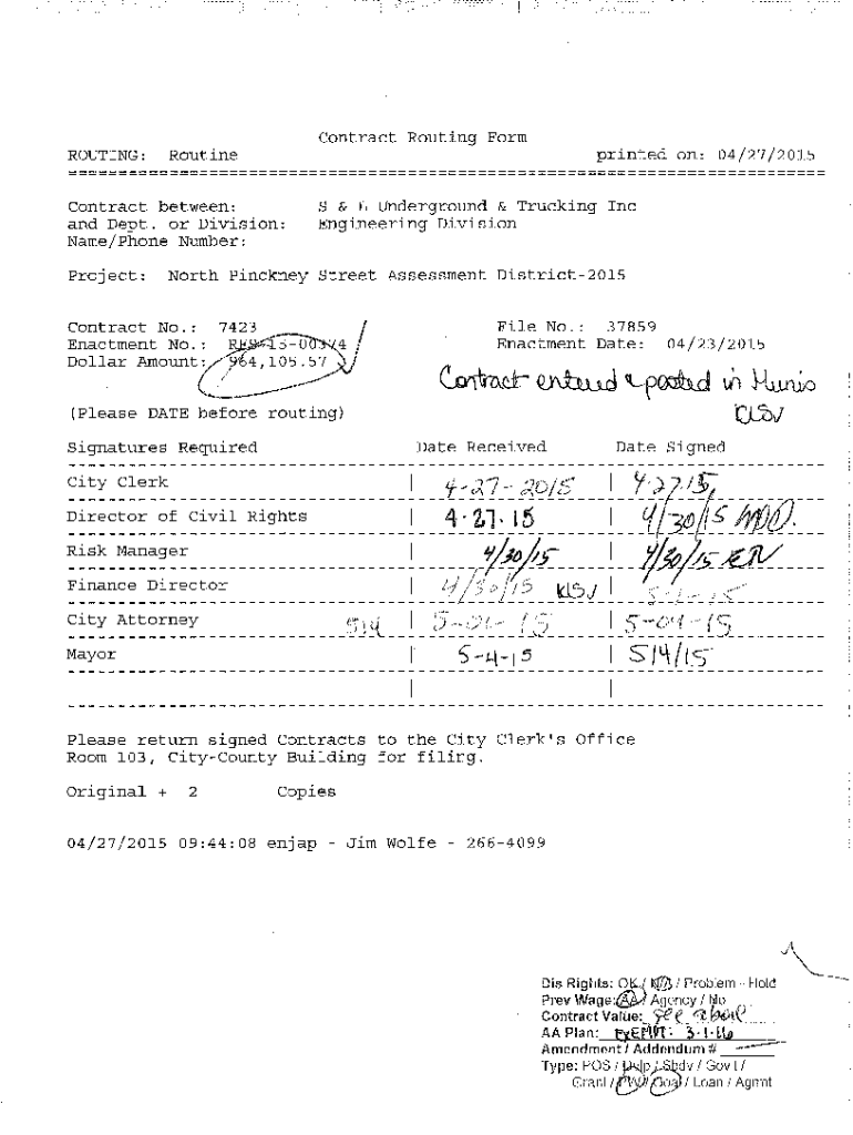 Contract Routing Form ROUTING:printed on: 04/27/2015Routine Contract between: and Dept. or Division: Name/Phone Number: Project's & L Underground & Trucking Inc Engineering Division North Pinckney