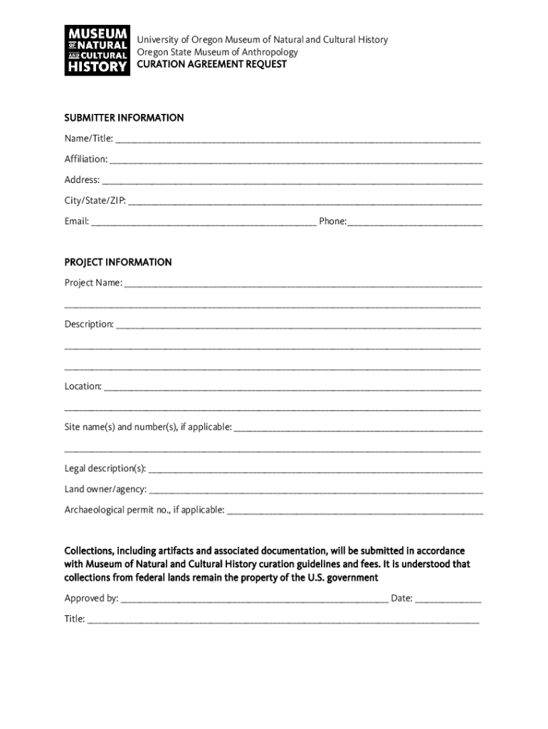 University of Oregon Museum of Natural and Cultural History Oregon State Museum of Anthropology CURATION AGREEMENT REQUESTSUBMITTER INFORMATION Name/Title: Affiliation: Address: City/State/ZIP: Email: