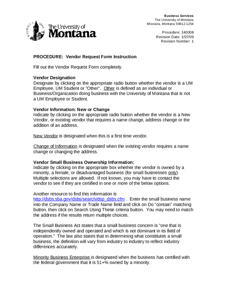 The Business Services - Business Services - University Of Montana is a fillable form in MS Word extension which can be filled-out and signed for specific needs. Next, it is furnished to the exact addressee to provide some details of certain kinds. The completion and signing may be done manually or with an appropriate solution e. g. PDFfiller. Such applications help to send in any PDF or Word file online. It also allows you to edit its appearance for the needs you have and put an official legal e-signature. Once done, you send the Business Services - Business Services - University Of Montana to the respective recipient or several recipients by email and even fax. PDFfiller offers a feature and options that make your Word template printable. It includes a number of settings when printing out. It does no matter how you'll distribute a document - in hard copy or by email - it will always look neat and clear. In order not to create a new document from the beginning over and over, turn the original file into a template. Later, you will have a rewritable sample.