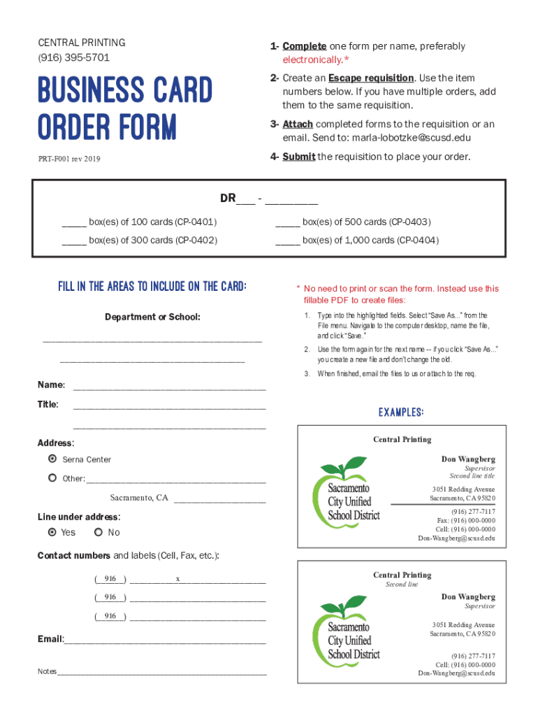 CENTRAL PRINTING (916) 39557011 Complete one form per name, preferably electronically.×Business Card Order Form2 Create an Escape requisition. Use the item numbers below. If you have multiple orders,