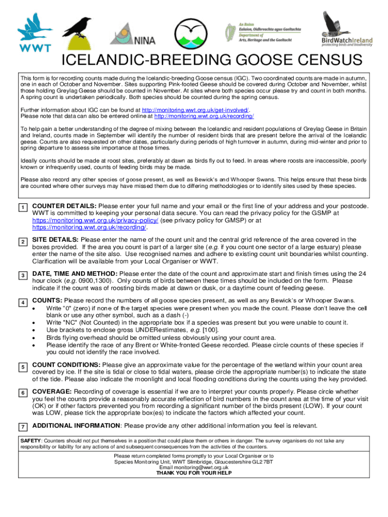 This form is for recording counts made during the Icelandic breeding Goose census (IGC). Two coordinated counts are made in autumn,