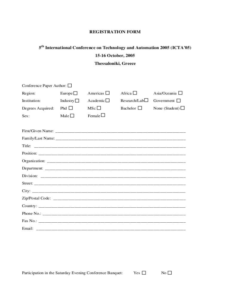 REGISTRATION FORM5th International Conference on Technology and Automation 2005 (ICT '05) 1516 October 2005 Thessaloniki, GreeceConference Paper Author: Region:EuropeAmericasAfricaAsia/OceaniaInstitution:IndustryAcademicResearch/LabGovernmentDegrees