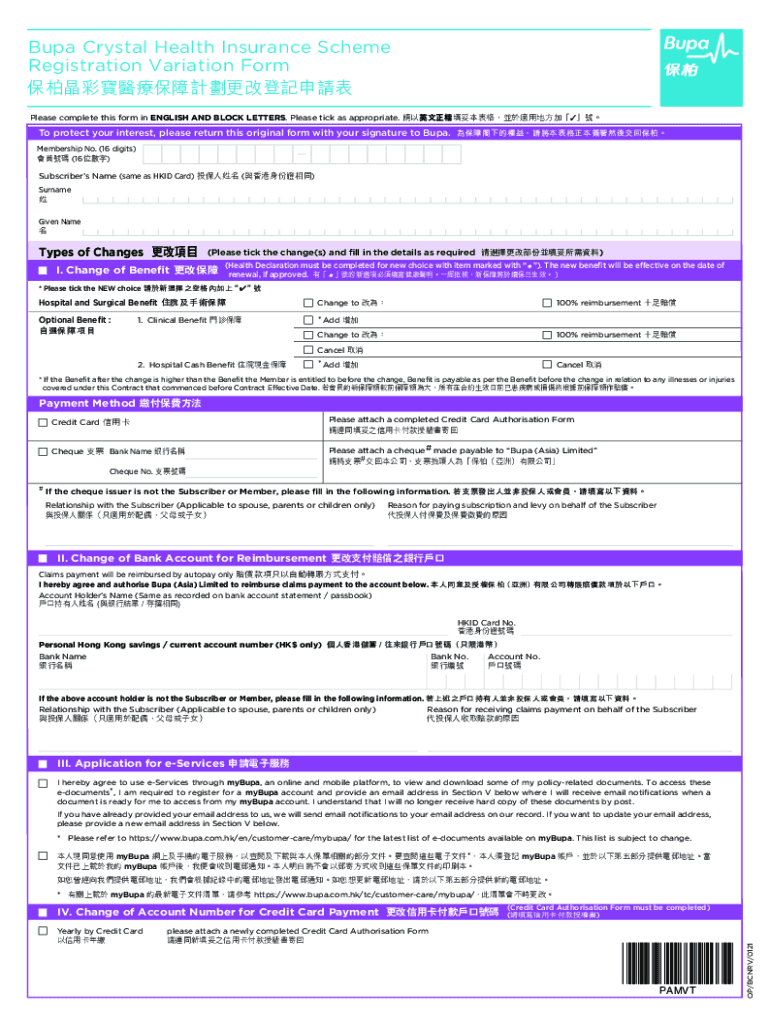 BPA Crystal Health Insurance Scheme Registration Variation Form Please complete this form in ENGLISH AND BLOCK LETTERS. Please tick as appropriate. To protect your interest, please return this original