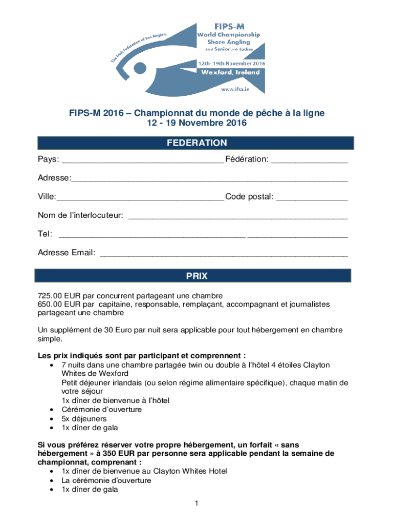 FI PSM 2016 Champion Du mode de Che la line 12 19 November 2016 FEDERATION Pays: Formation: Address: Villa: Code postal: Not DE interlocutor: Tel: Address Email: PRI 725.00 EUR par concurrent pageant