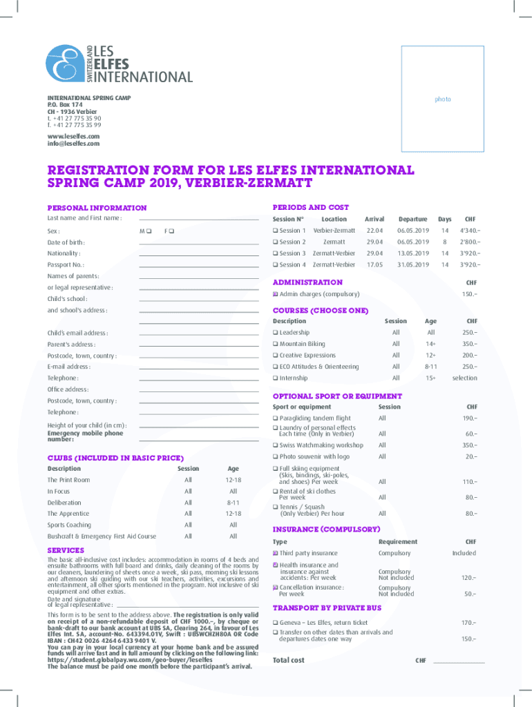 INTERNATIONAL SPRING CAMP P.O. Box 174 CH 1936 Vernier t. +41 27 775 35 90 f.+41 27 775 35 99photowww.leselfes.com info levels. Registration FORM FOR LES ELVES INTERNATIONAL SPRING CAMP 2019, VERBIERZERMATT
