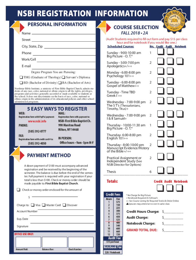 SBI REGISTRATION INFORMATION PERSONAL INFORMATIONCOURSE SELECTION FALL 2018 2AName(Audit Students required to fill out form and pay $15 per class hour and for notebook if you would like one.) Scheduled