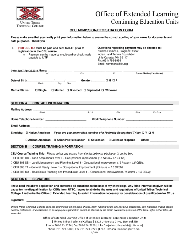 Office of Extended Learning To continue Education Units CEU ADMISSION/REGISTRATION FORM Please make sure that you neatly print your information below to ensure the correct spelling of your name for