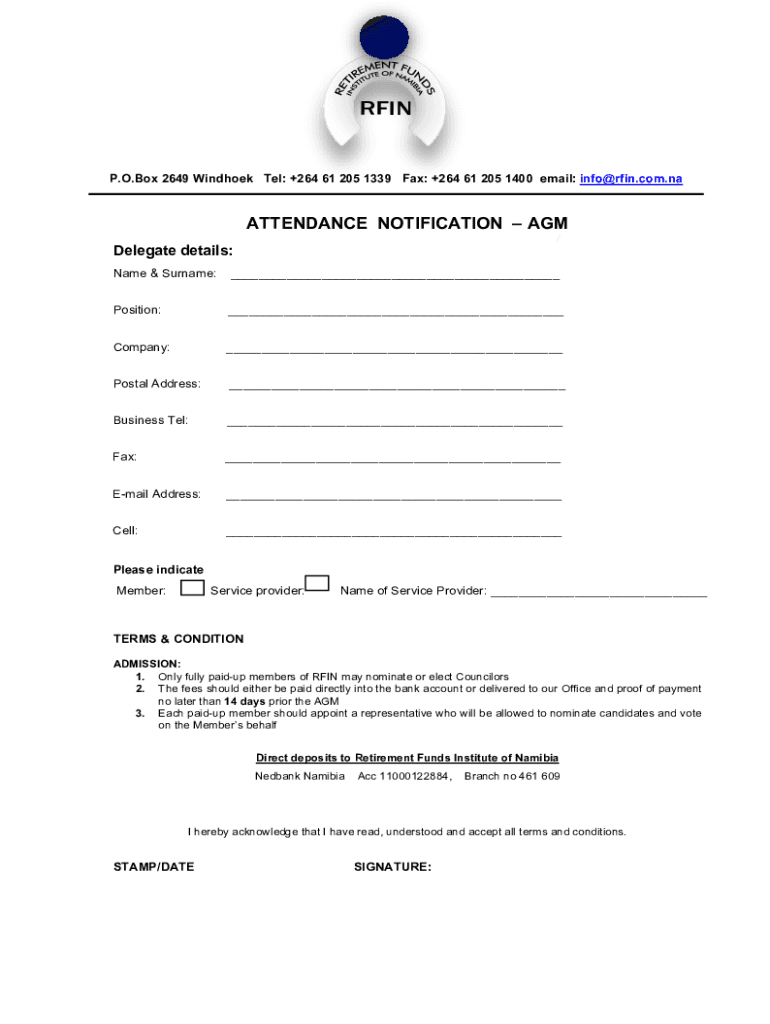 RAIN P.O. Box 2649 Windhoek Tel: +264 61 205 1339 Fax: +264 61 205 1400 email: info rfin.com.attendance NOTIFICATION AGM Delegate details: Name & Surname: Position: Company: Postal Address: Business