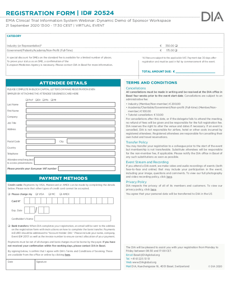 REGISTRATION FORM ID# 20524 EMA Clinical Trial Information System Webinar: Dynamic Demo of Sponsor Workspace 21 September 2020 13:00 17:30 CEST VIRTUAL EVENT CATEGORYIndustry (or Representative)*350.00
