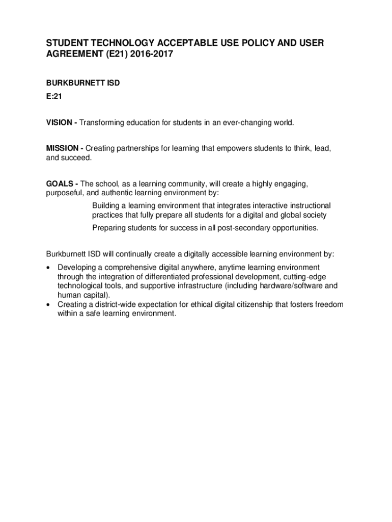 STUDENT TECHNOLOGY ACCEPTABLE USE POLICY AND USER AGREEMENT (E21) 20162017 BURKBURNETT ISD E:21 VISION Transforming education for students in an ever-changing world. MISSION Creating partnerships