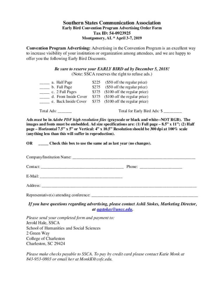 Southern States Communication Association Early Bird Convention Program Advertising Order Format ID: 540923925 Montgomery, AL * April 37, 2019Convention Program Advertising: Advertising in the Convention