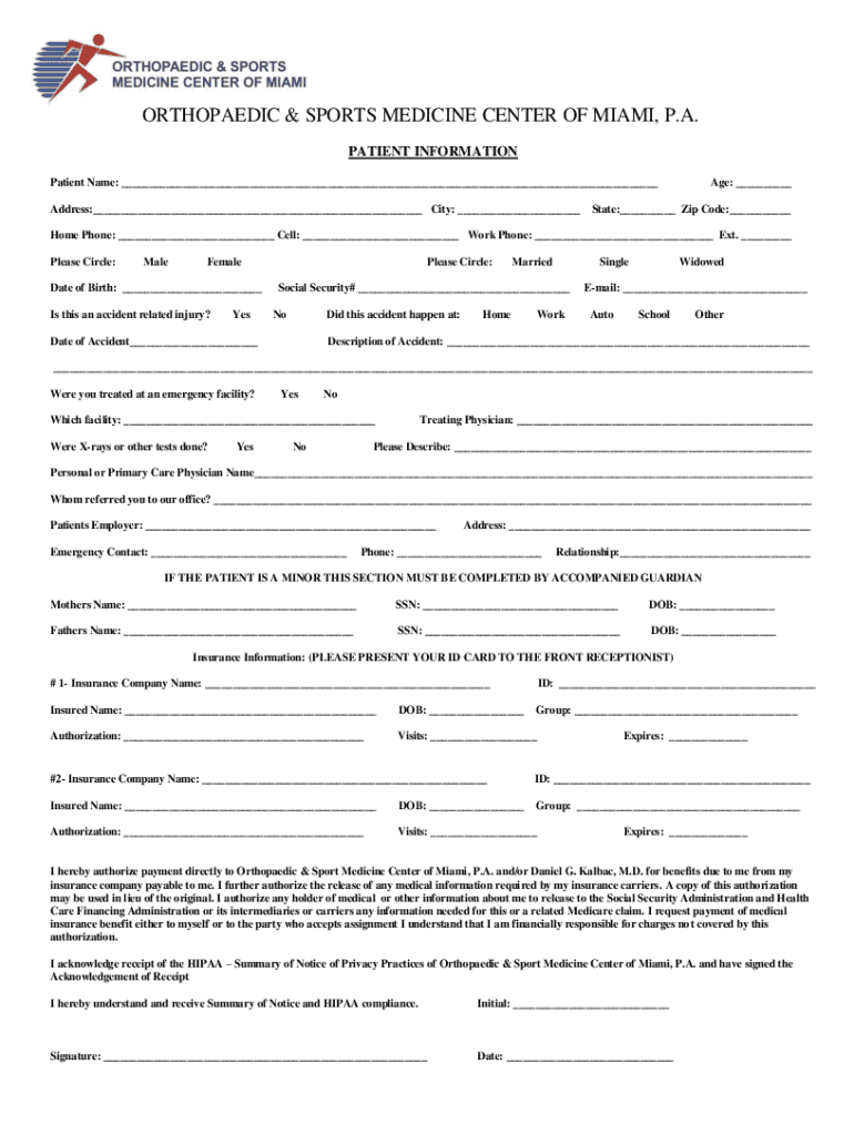 Orthopedic & SPORTS MEDICINE CENTER OF MIAMI, P.A. PATIENT INFORMATION Patient Name: Address: City: Age: State: Zip Code: Home Phone: Cell: Work Phone: Ext. Please Circle:MaleFemaleDate of Birth: