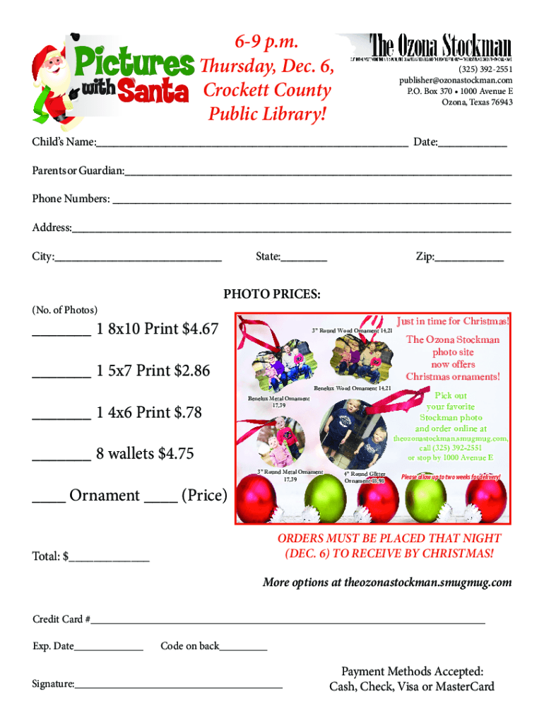 69 p.m. Thursday, Dec. 6, Crockett County Public Library!(325) 3922551 publisher ozonastockman.com P.O. Box 370 1000 Avenue E Ozone, Texas 76943Childs Name: Date: Parents or Guardian: Phone Numbers: