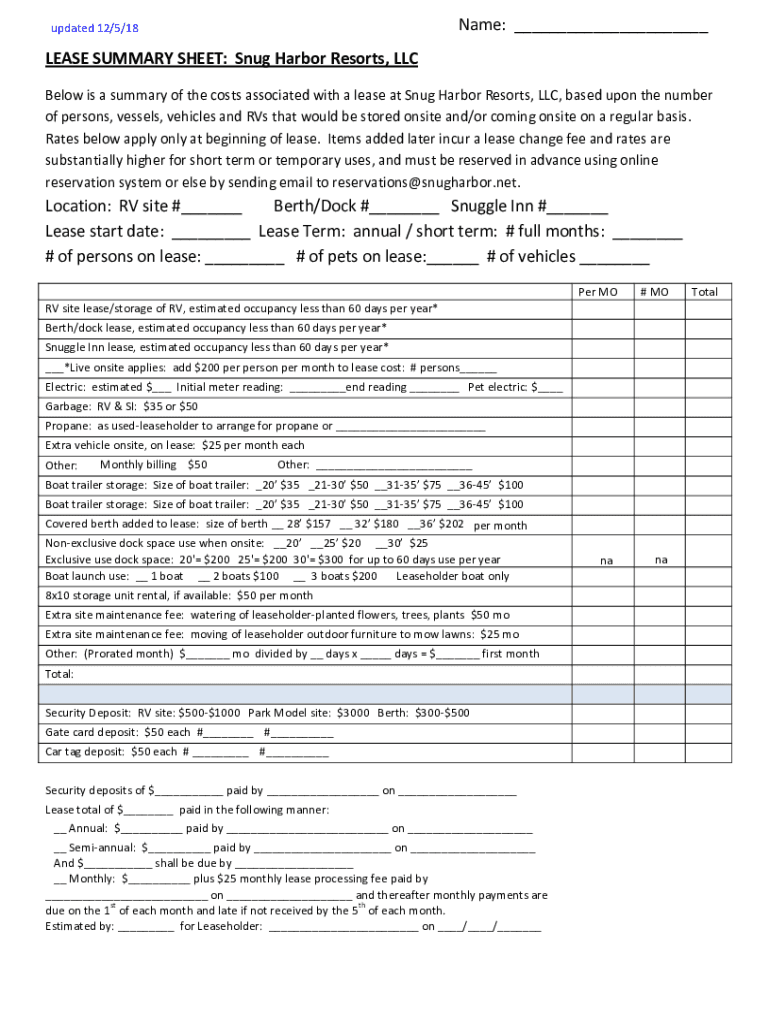 Updated 12/5/18Name: LEASE SUMMARY SHEET: Snug Harbor Resorts, LLC Below is a summary of the costs associated with a lease at Snug Harbor Resorts, LLC, based upon the number of persons, vessels, vehicles